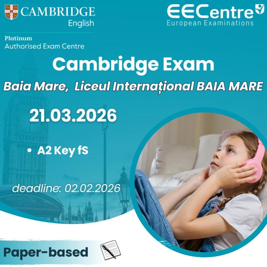 Liceul Internațional Baia Mare, școală acreditată de Cambridge University Press & Assessment și centru de examinare autorizat de European Examinations Centre, organizează testări în cadrul examenelor Cambridge, în vederea certificării nivelului de limba engleză A1 Key fS – Paper-based.