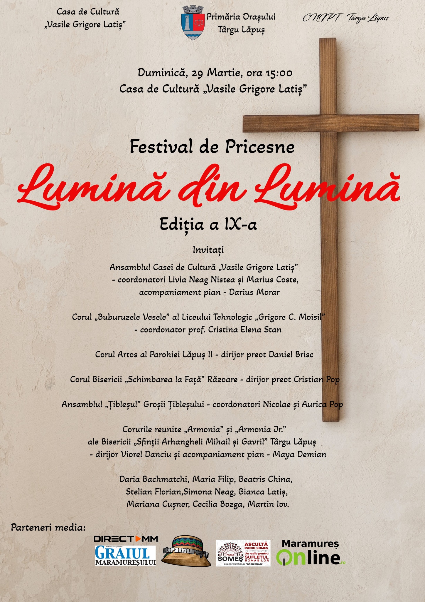 Vă invităm să fiți alături de noi la cea de-a IX-a ediție a Festivalului de Pricesne „Lumină din Lumină”, care va avea loc pe data de 29 martie, începând cu ora 15:00, pe scena Casei de Cultură „Vasile Grigore Latiș” din Târgu Lăpuș.