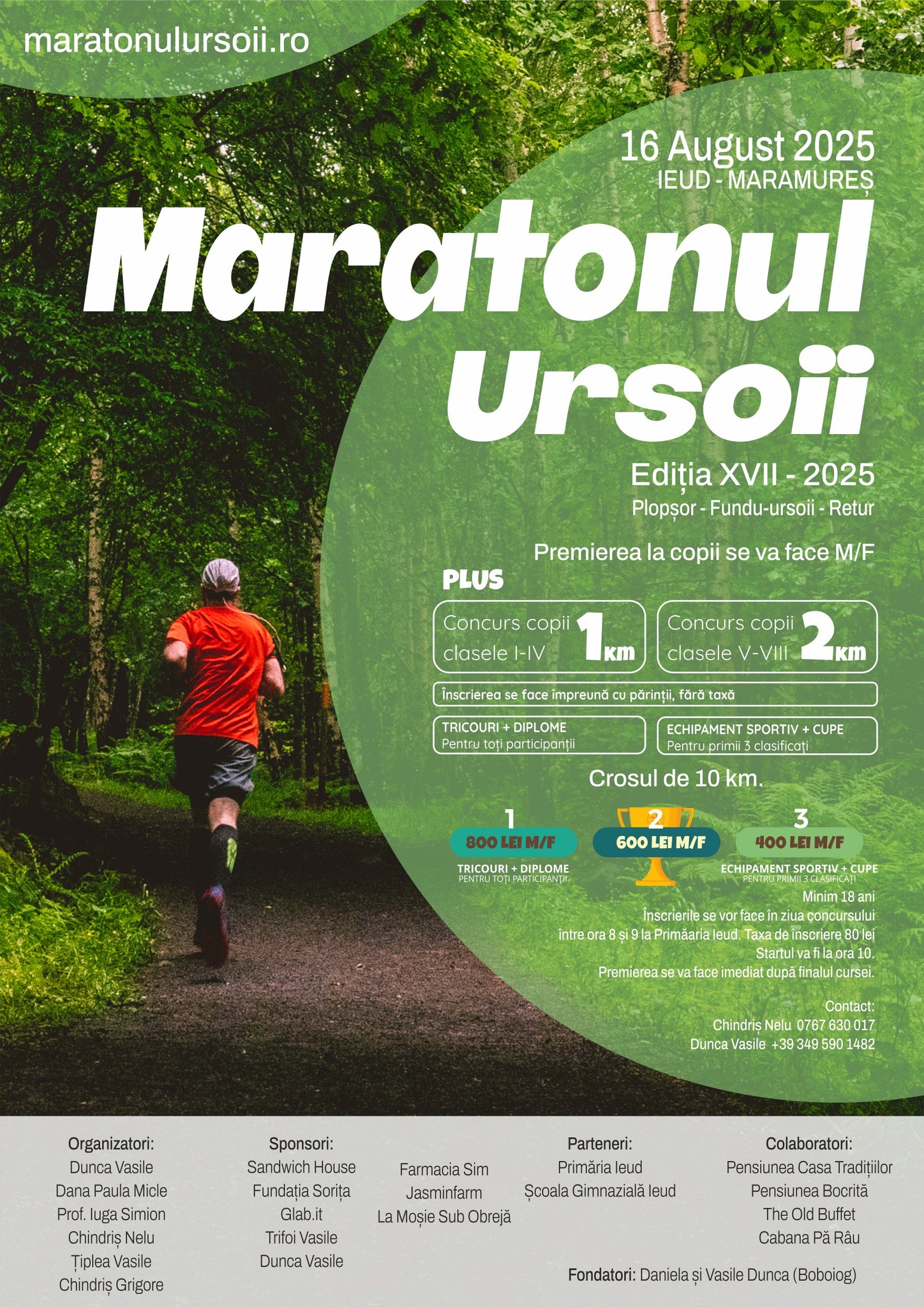 În 16 august, comuna maramureșeană Ieud se pregătește pentru cea de-a XVII-a ediție a „Maratonului Ursoii”, eveniment sportiv dedicat iubitorilor alergării și a naturii într-un cadru spectaculos de pe Valea Izei.