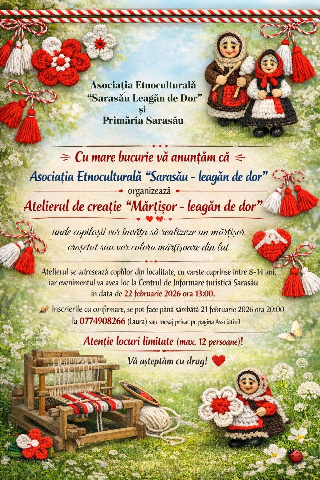 Cu mare bucurie vă anunțăm că Asociația Etnoculturală Sarasău – leagăn de dor” organizează Atelierul de creație „Mărțișor – leagăn de dor” unde copilașii vor învăța să realizeze un mărțișor croșetat, vor colora și vor avea ocazia să învețe cum se țese la război (tiară) într-o cameră autentică țărănească”, transmite Laura Hybris.