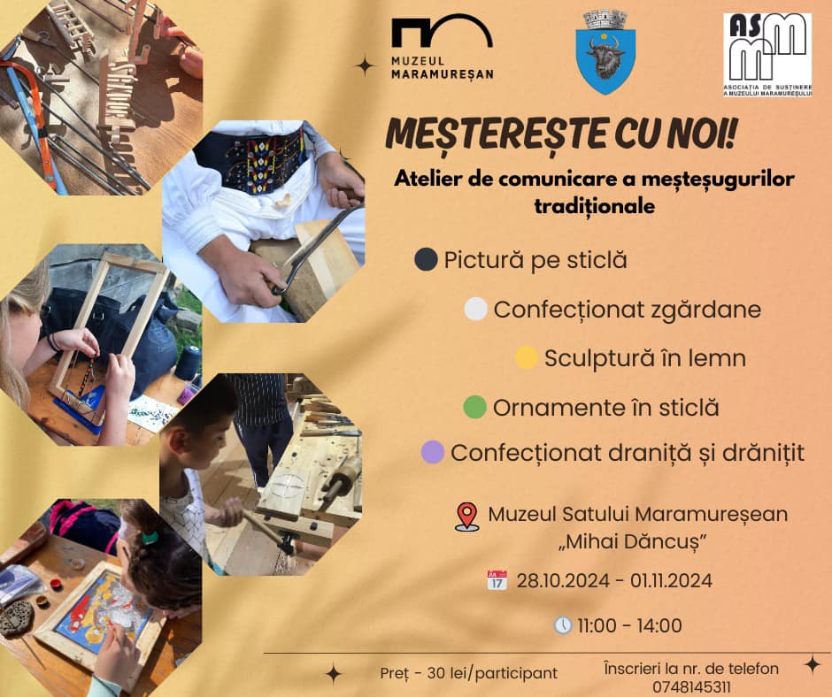 În perioada 28 octombrie – 1 noiembrie, între orele 11:00 și 14:00, la Muzeul Satului Maramureșean „Mihai Dăncuș” din Sighetu Marmației se va desfășura programul de comunicare a meșteșugurilor tradiționale – „Meșterește cu noi!”.