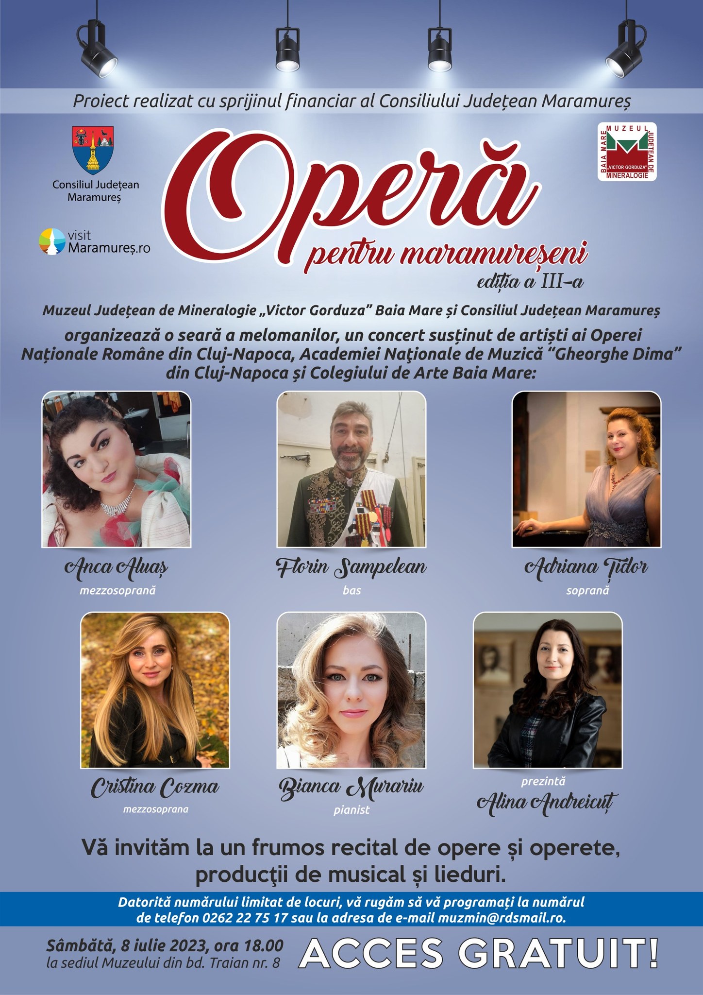 Având în vedere relația foarte bună de colaborare între artiști și instituția noastră, rezultată după organizarea edițiilor anterioare și disponibilitatea unor personalități de marcă ale muzicii românești, soprane, mezzosoprane și bași, din cadrul Operei Naționale Române Cluj – Napoca, Academia Națională de Muzică „Gheorghe Doma” din Cluj Napoca și Colegiul de Arte din Baia Mare, de a concerta într-un mediu muzeal de excepție, considerăm o excelentă oportunitate organizarea unui concert de muzică clasică. Spectacolul va conține recitaluri de arii și duete din opere și operete, producții de musical și lieduri românești și internaționale” – spun organizatorii.