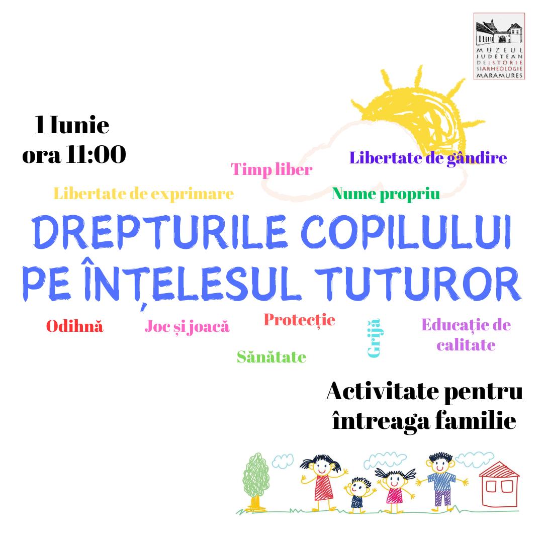 Pe 1 Iunie, ora 11:00 – Drepturile copilului pe înțelesul tuturor – activitate pentru întreaga familie despre istoria copilăriei și drepturile copilului susținută de muzeograf dr. Oana-Alexandra Chirilă și organizată cu sprijinul Salvați Copiii. Intrarea liberă.