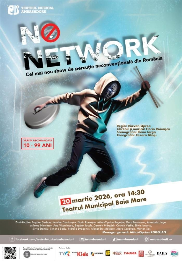 Cel mai nou spectacol de percuție neconvențională din România intitulat „No Network” va avea loc, în premieră, în Baia Mare. Liceul Internațional din Baia Mare, în calitate de partener, vă invită la spectacolul conceput de Mihai-Ciprian Rogojan, fost membru al trupei SISTEM, care va avea loc la Teatrul Municipal Baia Mare în 20 martie, la ora 14:30.