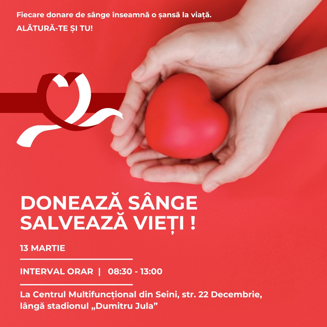 Joi, 13 martie, în intervalul orar 08:30 – 13:00, la Centrul Multifuncțional din Seini (str. 22 decembrie, lângă stadionul „Dumitru Jula”) va avea loc o campanie de donare de sânge.