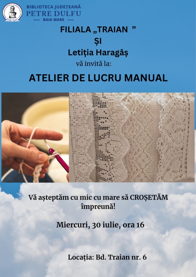 Această ediție propune, de această dată, un atelier de croșetat, coordonat de doamna Letiția Haragâș. Materialele necesare acestei activități sunt: un ac special pentru croșetat și ață în culoarea dorită de fiecare participantă.