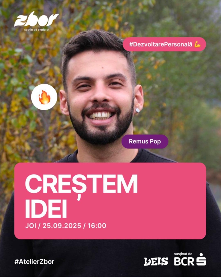 Începând cu ora 16:00, Remus Pop vă invită la atelierul „Creștem idei”, în care ideile vor fi exprimate liber și vor fi transformate în planuri concrete. Veți învăța cum să dați viață gândurilor voastre și să le creșteți până devin proiecte cu un impact real. Dacă ați avut vreodată o idee genială care a rămas în notițele telefonului sau ați visat să faceți ceva măreț, dar nu ați știut de unde să începeți, atunci acest atelier este pentru voi!
