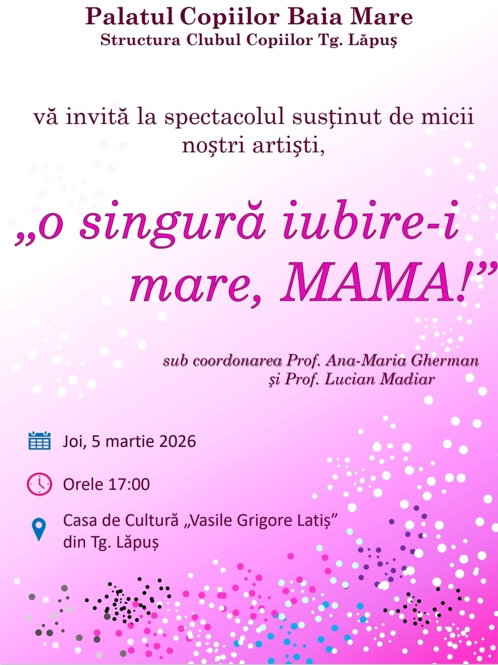 Palatul Copiilor Baia Mare – Structura Clubul Copiilor Târgu Lăpuș organizează joi, 5 martie, de la ora 17:00, la Casa de Cultură „Vasile Grigore Latiș”, un spectacol dedicat mamelor.