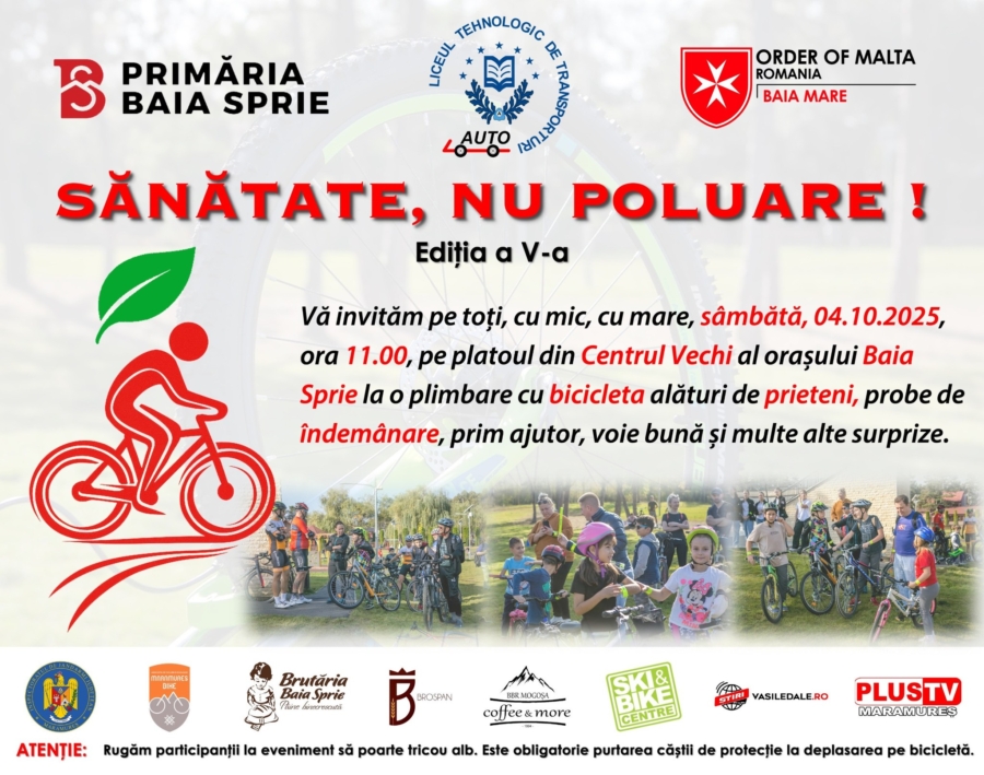 Sâmbătă, 4 octombrie de la ora 11:00, sunteți invitați pe platoul din Centrul Vechi al orașului Baia Sprie, la o plimbare cu bicicleta, probe de îndemânare, prim ajutor și multe alte surprize.