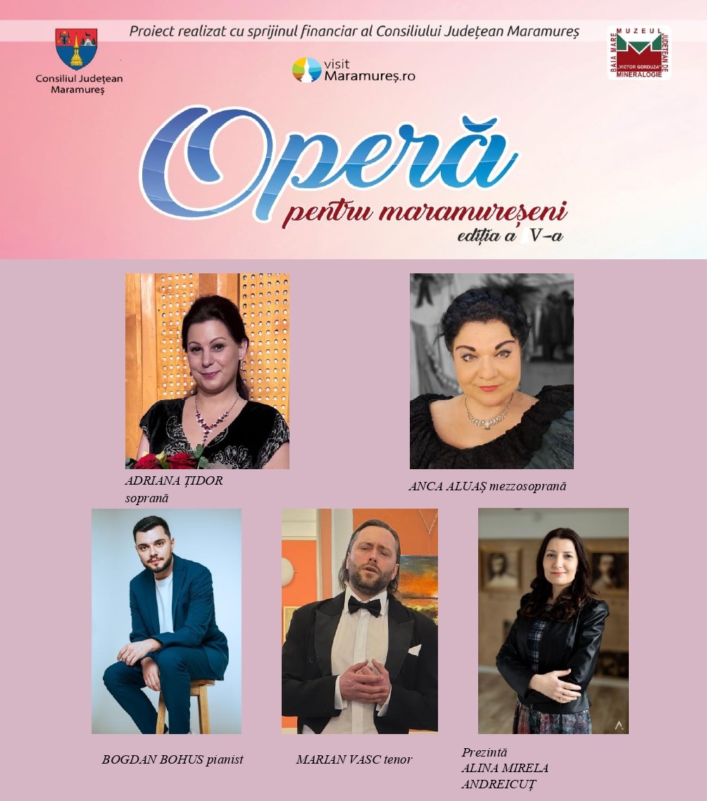 În 4 iulie, de la ora 18, Muzeul de Mineralogie ”Victor Gorduza” din Baia Mare va găzdui a cincea ediție a evenimentului ”Operă pentru maramureșeni”. Participă soprana Adriana Țidor, mezzosoprana Anca Aluaș, tenorul Adrian Vasc, pianistul Bogdan Bohus. Prezintă Alina Mirela Andreicuț. Accesul este gratuit. Rezervări: 0262227517; muzmin@rdsmail.ro.