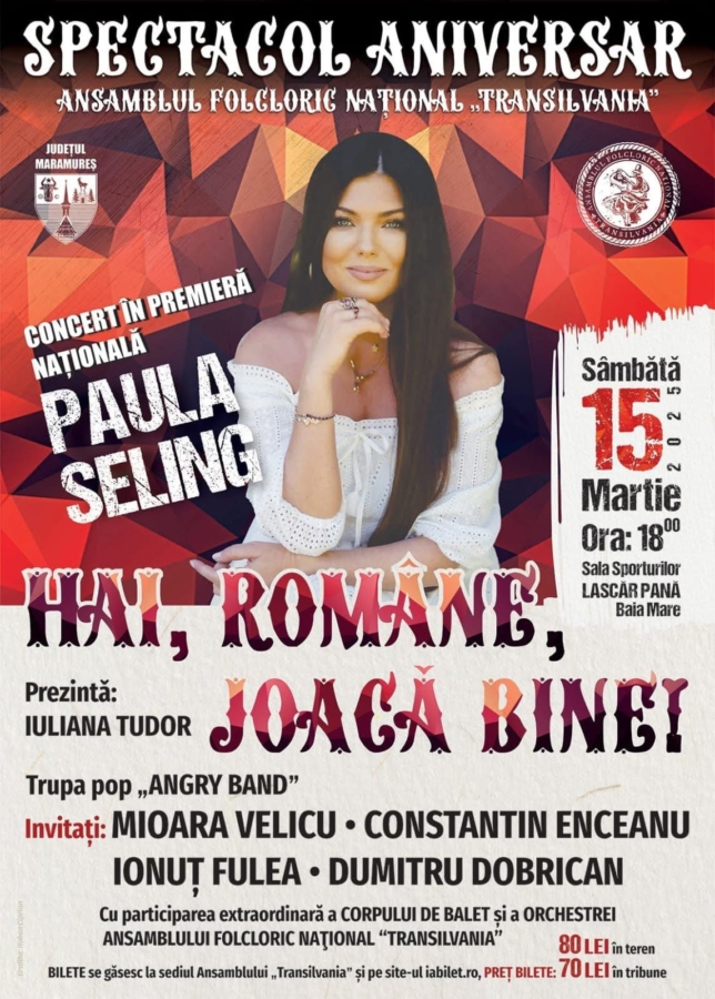 Sâmbătă, 15 martie de la ora 18:00, îndrăgita cântăreață Paula Seling va cânta în cadrul concertului „Hai, române, joacă bine!”, la Sala Sporturilor „Lascăr Pană” din Baia Mare. Spectacolul în premieră națională va avea loc exact în ziua în care a luat ființă Ansamblul Folcloric Național „Transilvania”, fiind găzduit de Iuliana Tudor, vedeta Televiziunii Române.