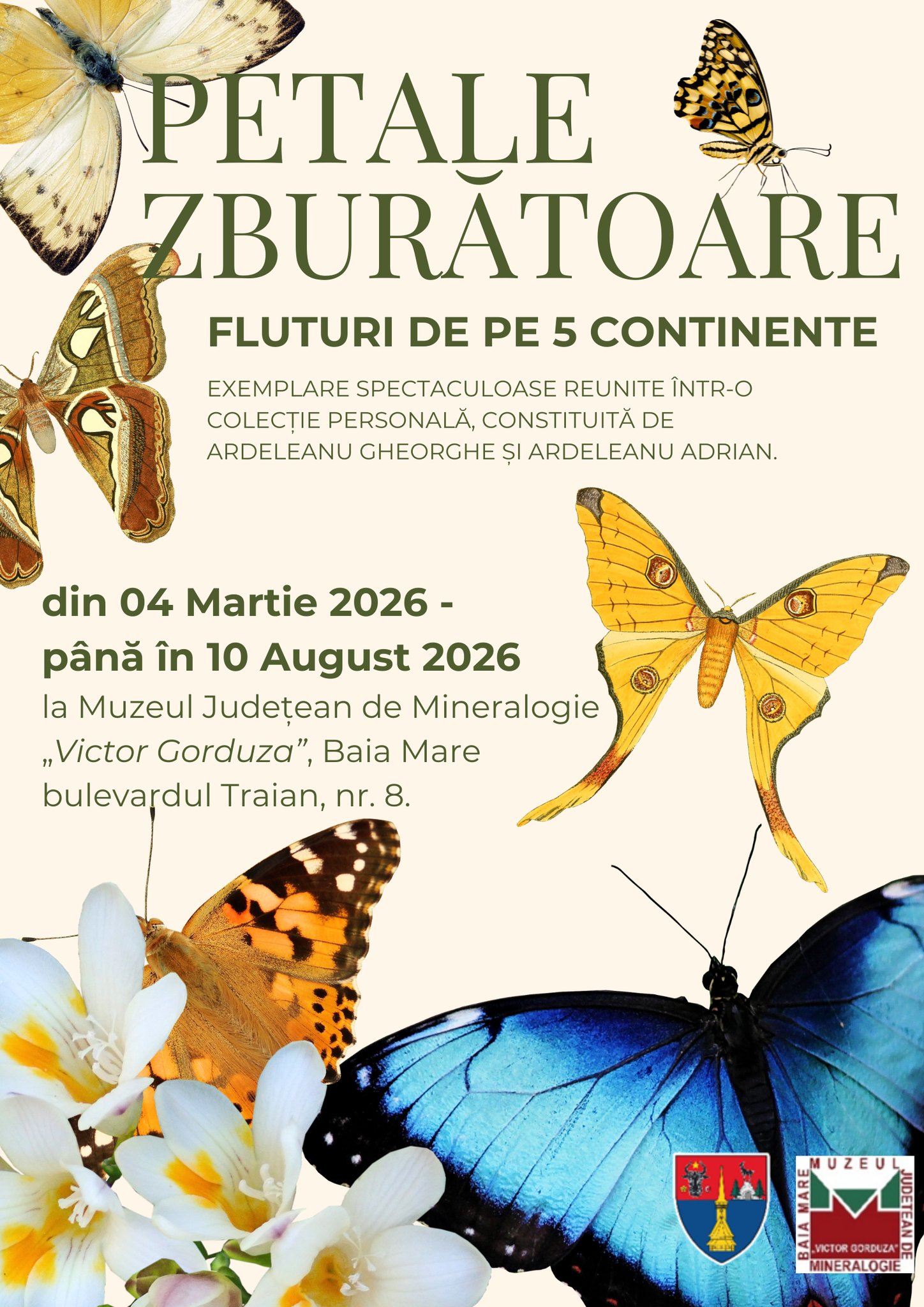 O incursiune spectaculoasă în lumea delicată a fluturilor este propusă publicului începând cu data de 4 martie, odată cu deschiderea expoziției temporare „Petale zburătoare – fluturi de pe 5 continente”, găzduită de Muzeul de Mineralogie Baia Mare.