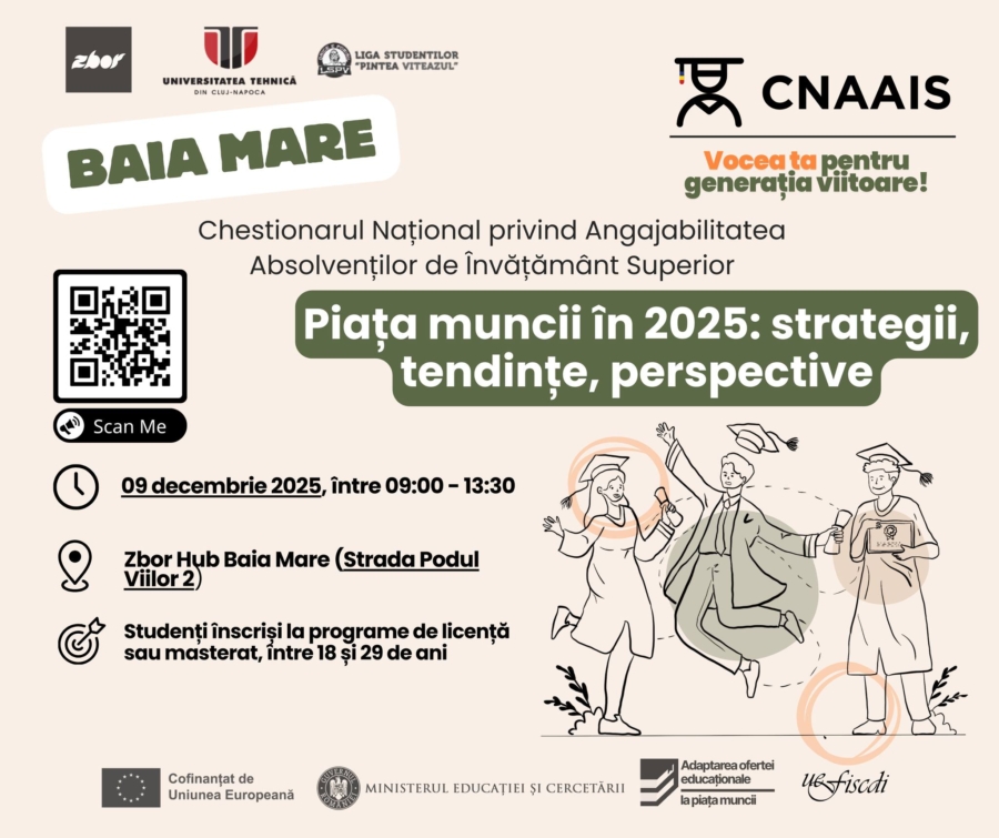 Evenimentul pe tema „Piața muncii în 2025. Strategii, tendințe, perspective”, derulat în cadrul Chestionarului Național privind Angajabilitatea Absolvenților de Învățământ Superior (CNAAIS) ajunge în Baia Mare pe 9 decembrie, între orele 09:00–13:30, la Zbor Hub Baia Mare.
