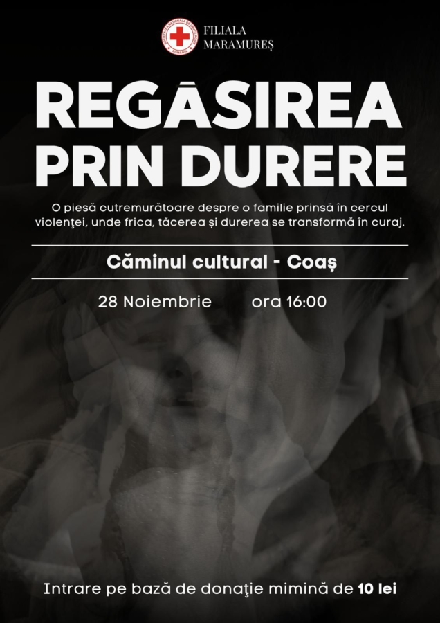În data de 28 noiembrie de la ora 16:00, voluntarii de la Crucea Roșie Română- Filiala Maramureș organizează piesa de teatru „Regăsirea prin durere”, la Căminul Cultural Coaș.