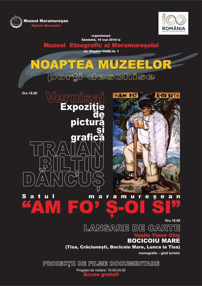 Sâmbătă, 19 mai, la Muzeul Etnografic al Maramureșului din Sighetu Marmației, va avea loc Noaptea Muzeelor – porți deschise”. Din program: 18.00 – vernisajul expoziției de pictură și grafică „Satul maramureșean – Am fo’ ș-oi si” a artistului Traian Bilțiu Dăncuș ● 19.00 – lansarea monografiei ”Bocicoiu Mare” (Tisa, Crăciunești, Bocicoiu Mare, Lunca la Tisa), autor Vasile Timur Chiș ● 19.00 -24.00 – proiecții de filme documentare.