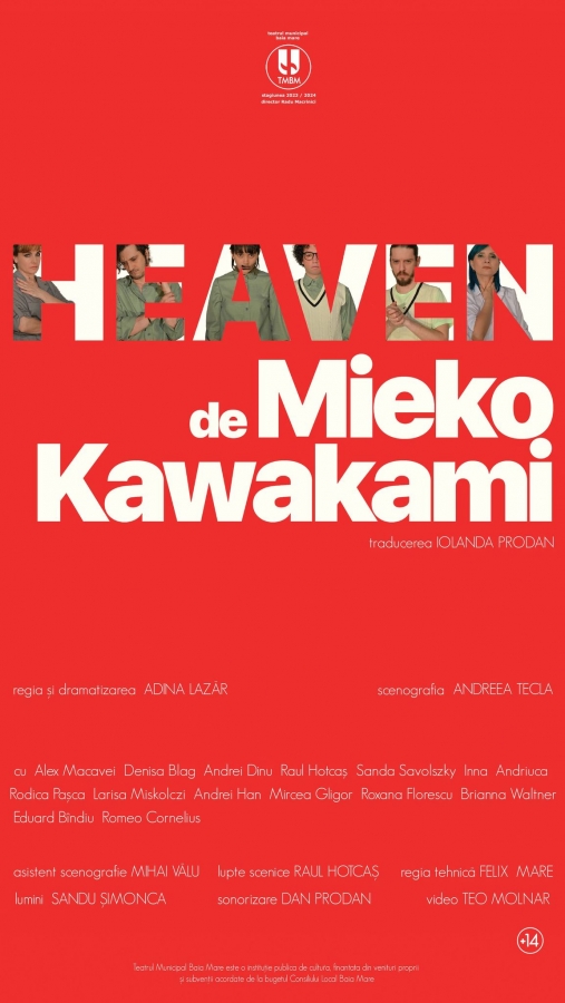 Teatrul Municipal Baia Mare invită publicul băimărean la premiera spectacolului cu piesa Heaven, de Mieko Kawakami, ce va avea loc duminică, 17 martie, de la ora 19.00.