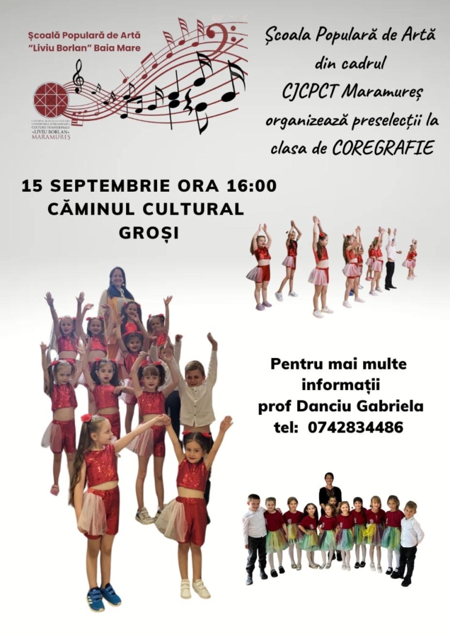 Școala Populară de Arte „Liviu Borlan” Baia Mare organizează preselecții pentru clasa de coregrafie, la Căminul Cultural din comuna Groși. Preselecțiile vor avea loc luni, 15 septembrie 2025, de la ora 16:00.