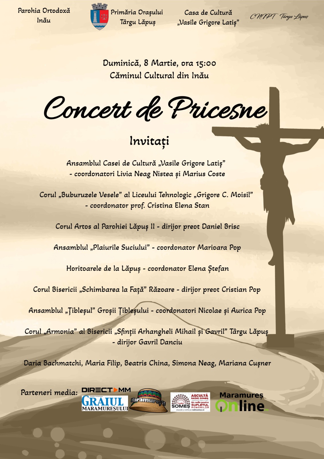 Duminică, 8 martie, de la ora 15:00, Căminul Cultural din Inău va găzdui un concert de pricesne.
