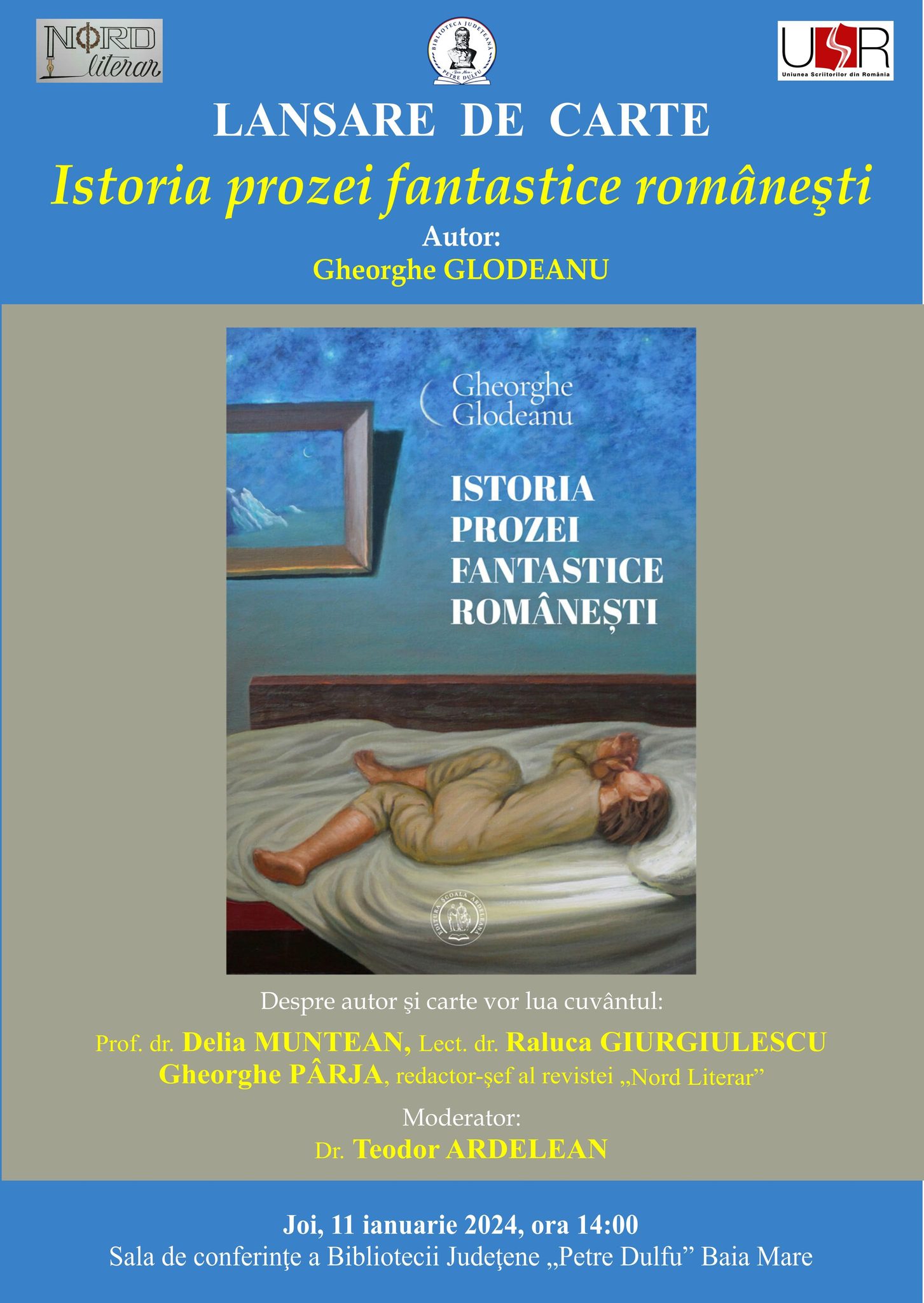 Joi, 11 ianuarie, de la ora 14.00, Biblioteca Județeană „Petre Dulfu” Baia Mare organizează lansarea volumului „Istoria prozei fantastice românești”, autor Gheorghe Glodeanu, apărut la Editura Școala Ardeleană, Cluj-Napoca, 2023.