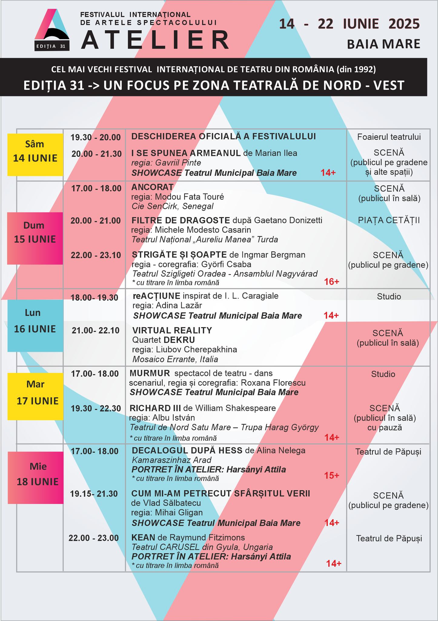”La ediția cu numărul 31, Festivalul Internațional de Artele Spectacolului “Atelier” se concentrează pe spațiul teatral nord-vestic, propunându-și să realizeze o radiografie a acestei zone efervescente, caracterizată prin diversitatea culturală, etnică, religioasă, lingvistică, dar și în ceea ce privește oferta repertorială a teatrelor invitate”, se arată într-o postare de pe pagina de Facebook a Municipalului băimărean.
