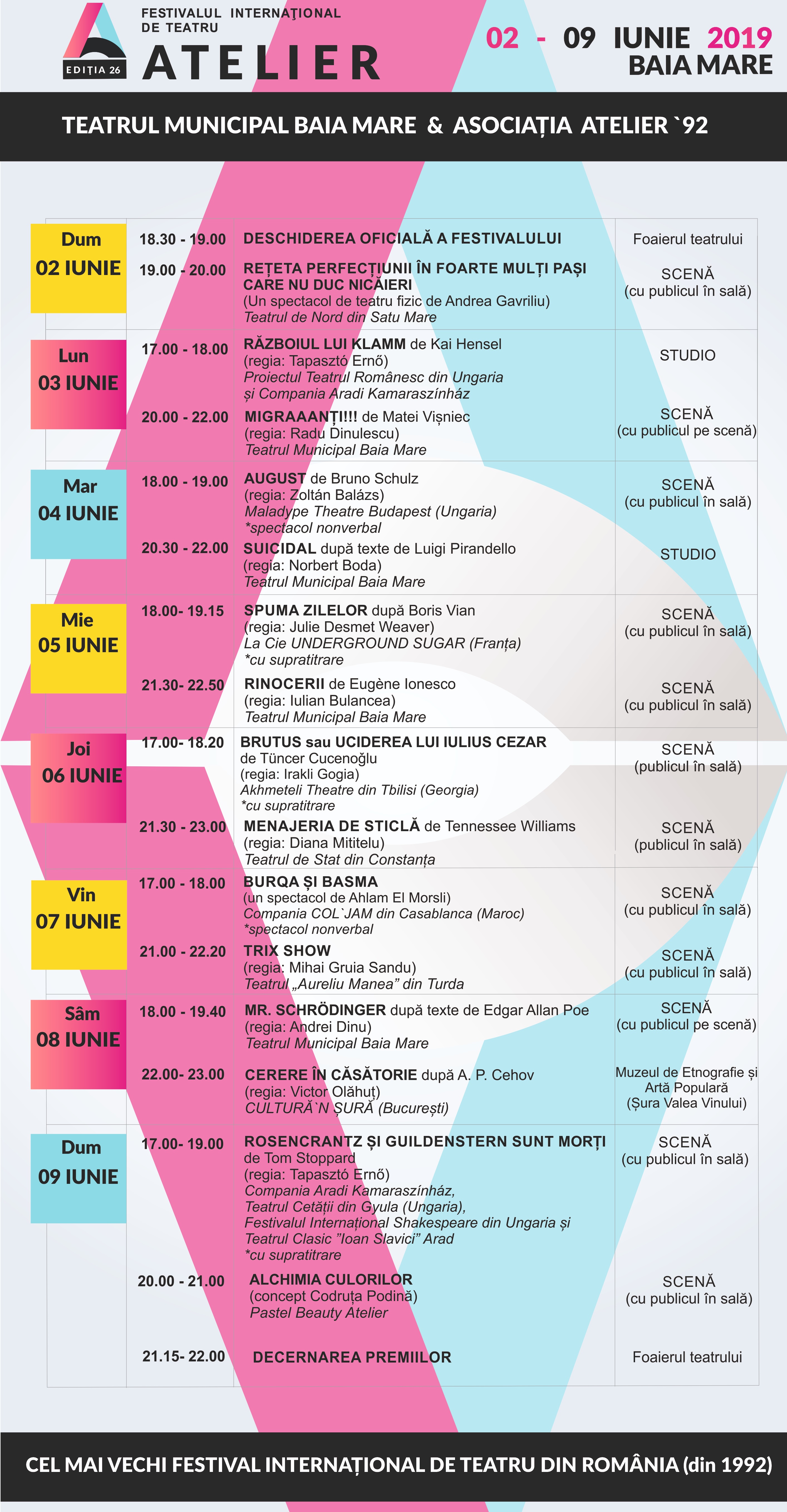 PROGRAMUL FESTIVALULUI DE TEATRU ”ATELIER”, 2-9 IUNIE 2019