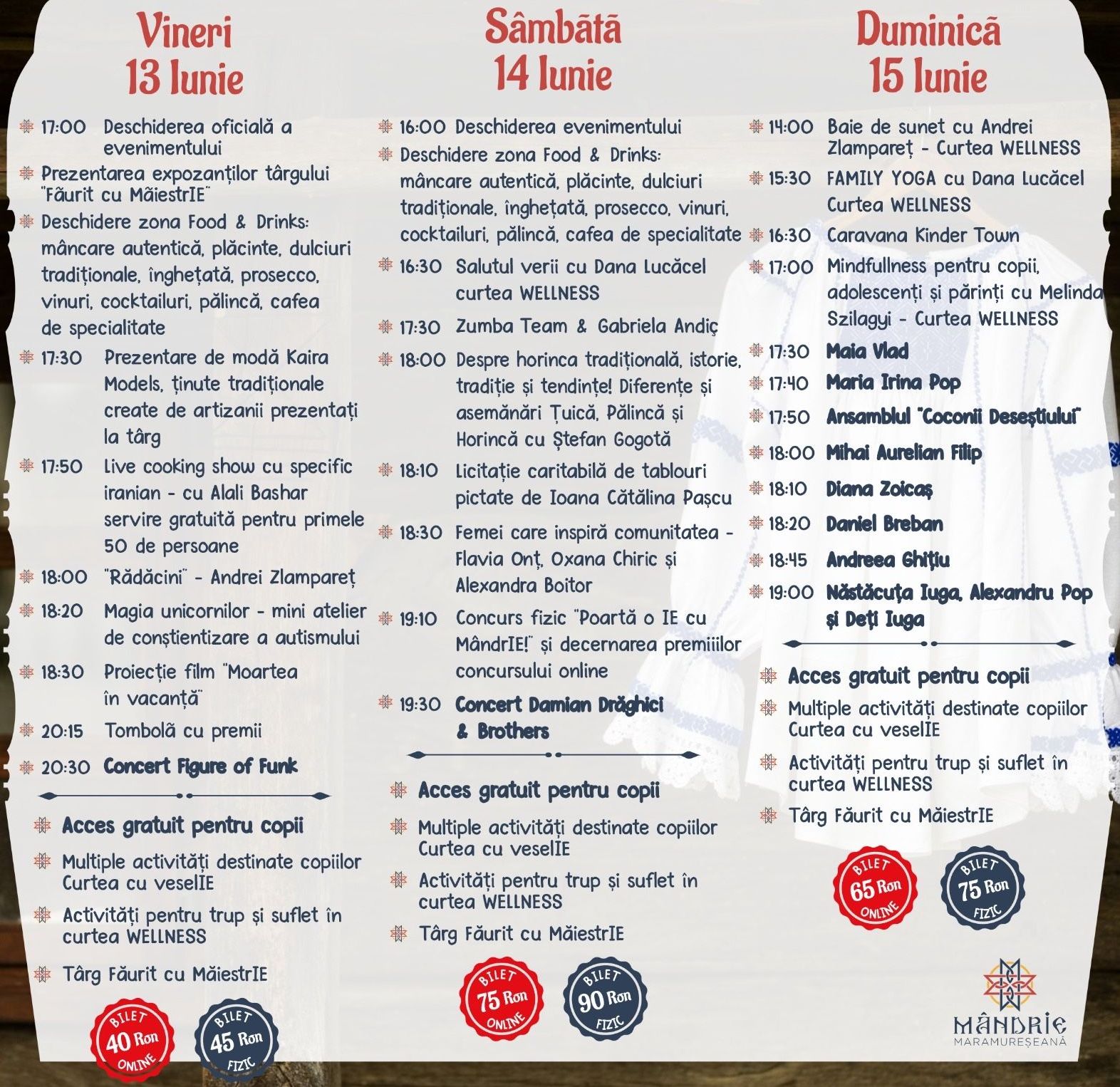 În perioada 13-15 iunie Muzeul Satului din Baia Mare va găzdui Festivalul „MândrIE Maramureșeană”. Într-un decor tradițional, evenimentul vine cu un program bogat. Vor fi recitaluri ale unor artiști îndrăgiți, precum Damian Drăghici, Deți Iuga, Năstăcuța Iuga, Alexandru Pop, Andreea Ghițiu, Daniel Breban, Mihai Aurelian Filip. Agenda festivalului cuprinde și proiecții de film, dar și meșteșuguri și ateliere interactive. Nu vor lipsi bucatele tradiționale maramureșene, concursurile și tombolele.
