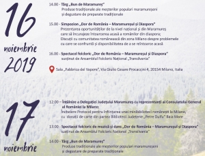 Maramureșul va fi mai aproape de românii din Italia, prin manifestările culturale ”Dor de România – Maramureșul și Diaspora”, care vor avea loc la Milano, în 16 și 17 noiembrie. Prin acest proiect, Consiliul Județean dorește să aducă mai aproape de românii care trăiesc în Milano Maramureșul cu tradiţiile, folclorul şi bucătăria specifică. În cele două zile, comunitatea românească din Milano, precum și localnici și turiști străini se vor bucura de spectacole folclorice de muzică și dans oferite de artiști maramureșeni, vor admira produse ale meșterilor populari din județ și vor degusta bucate tradiționale în cadrul Târgului ”Bun de Maramureș”. De asemenea, se va înființa o minibibliotecă românească, în urma unor donații de carte din partea Bibliotecii Județene ”Petre Dulfu” Baia Mare. Contribuie la acest proiect Ansamblul Folcloric Naţional „Transilvania”, Biblioteca Județeană, Centrul Judeţean pentru Conservarea și Promovarea Culturii Tradiţionale, Muzeul de Etnografie și Artă Populară Maramureș și asociații ale românilor din Italia.