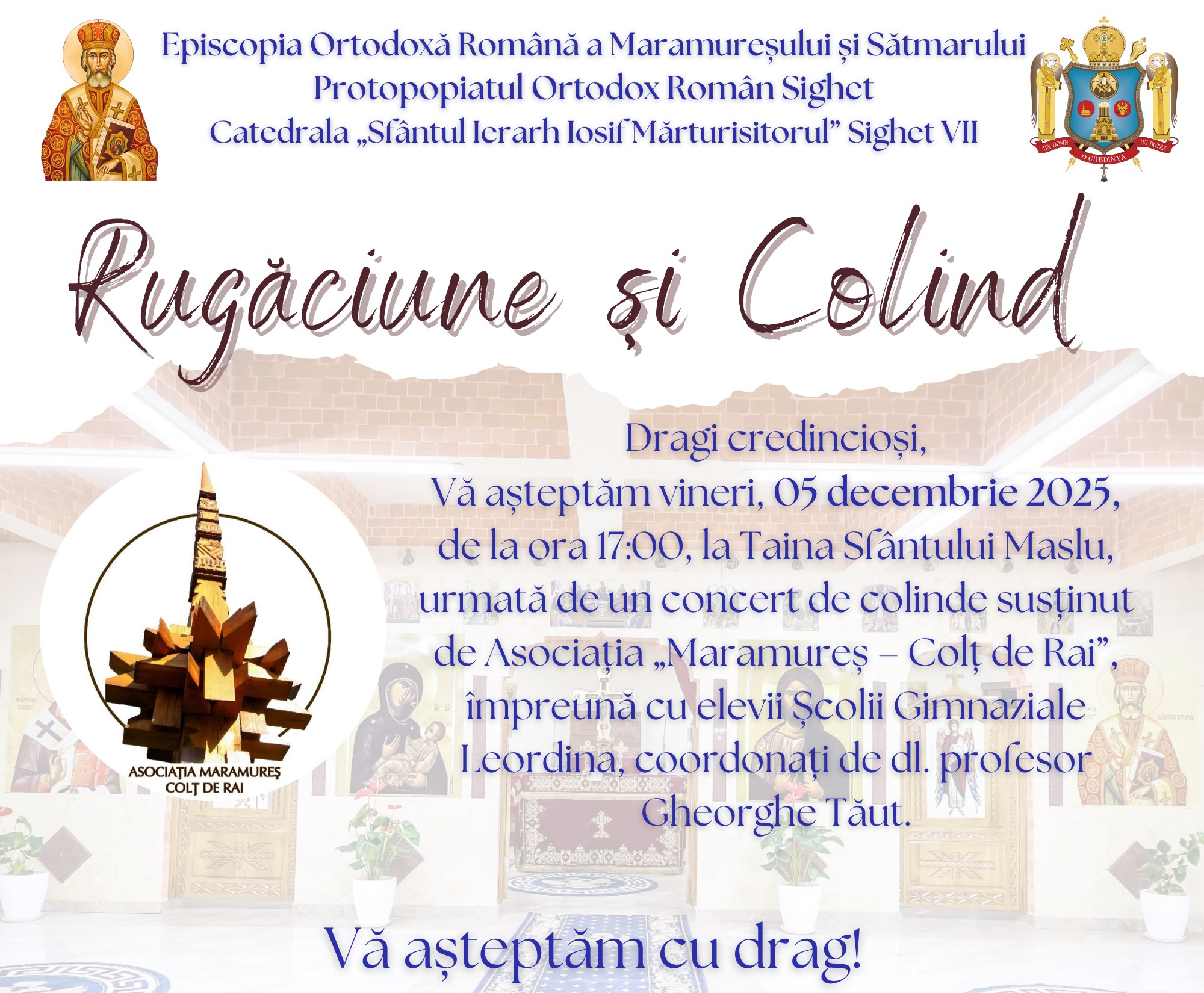 Credincioșii din Sighetu Marmației sunt așteptați azi, 5 decembrie, începând cu ora 17:00, la Catedrala „Sfântul Ierarh Iosif Mărturisitorul”, pentru a participa la o seară de rugăciune și colind, un eveniment special organizat în prag de sărbători.