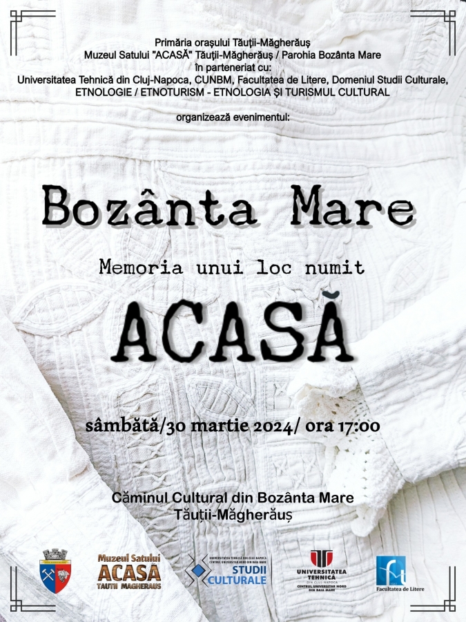 Sâmbătă, 30 martie, de la ora 17.00, Căminul Cultural din Bozânta Mare (Tăuții Măgherăuș) va găzdui evenimentul „Bozânta Mare – momoria unui loc numit ACASĂ”.