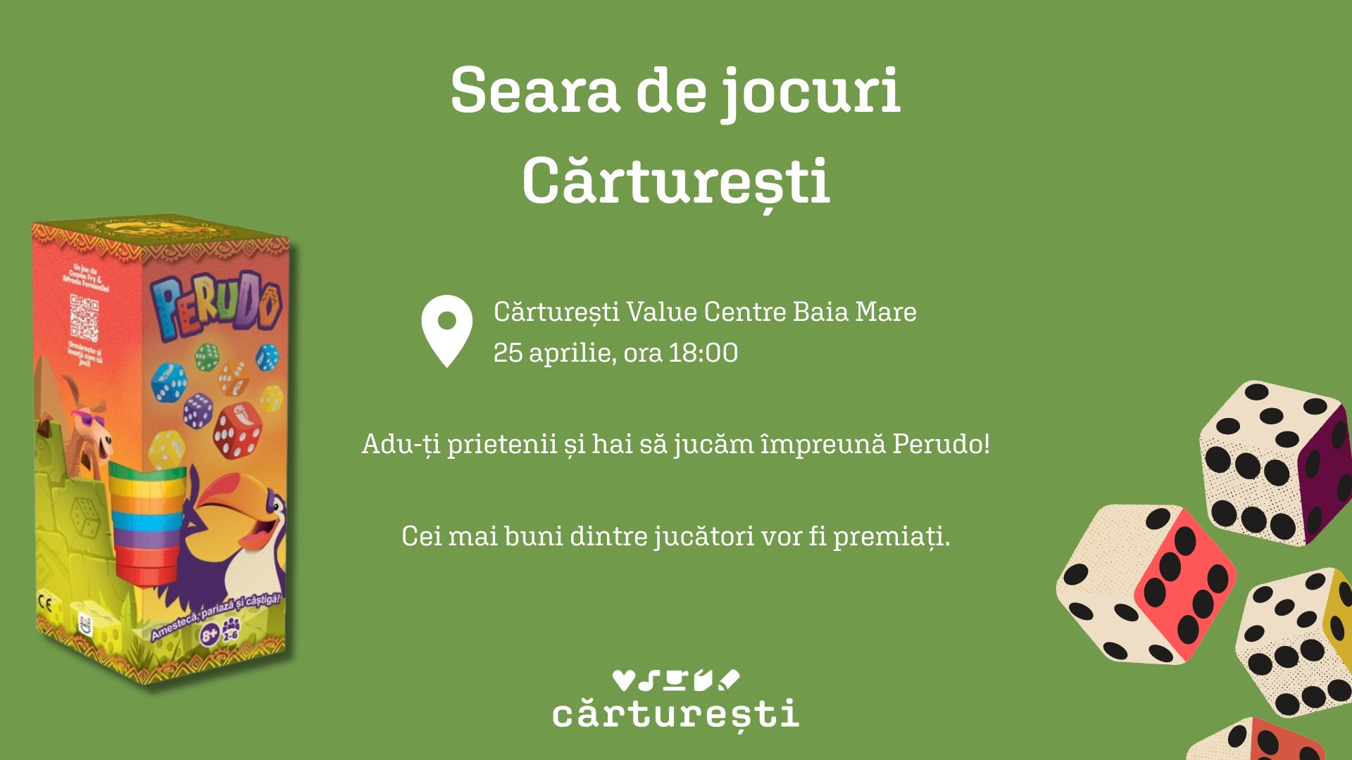 ”Vă era dor de o seară fun, de jocuri? Și nouă! Pentru întâlnirea din 25 aprilie, propunem un joc super distractiv, pe care să îl putem juca în număr cât mai mare! Este vorba despre Perudo. Dacă nu l-ai mai jucat, nu îți face griji! Abia așteptăm să-l descoperim împreună!”, anunță organizatorii. Intrarea este liberă.