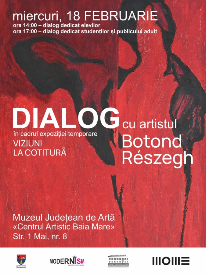 Muzeul Judetean de Artă «Centrul Artistic Baia Mare» lansează invitația de a participa miercuri, 18 februarie, la un dialog deschis cu artistul Reszegh Botond, pe marginea expoziției „Viziuni la cotitură” semnată de acesta, curatoriată de Kinga German. Evenimentul este împărțit în două sesiuni de dialog, una dedicată elevilor, care va avea loc de la ora 14:00 și una dedicată studenților și publicului adult, care va avea loc de la ora 17:00, la sediul muzeului situat pe strada 1 Mai nr. 8.