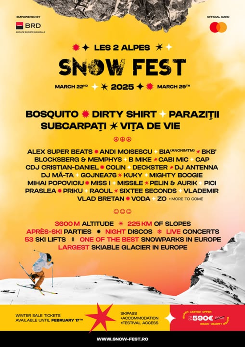 În perioada 22-29 martie 2025, stațiunea montană Les Deux Alpes din Franța va găzdui cea de-a 13-a ediție a Snow Fest, un festival dedicat pasionaților de sporturi de iarnă și muzică. Evenimentul reunește anual peste 3.000 de participanți, majoritatea din România, care se bucură de o săptămână plină de activități pe pârtie și petreceri memorabile.