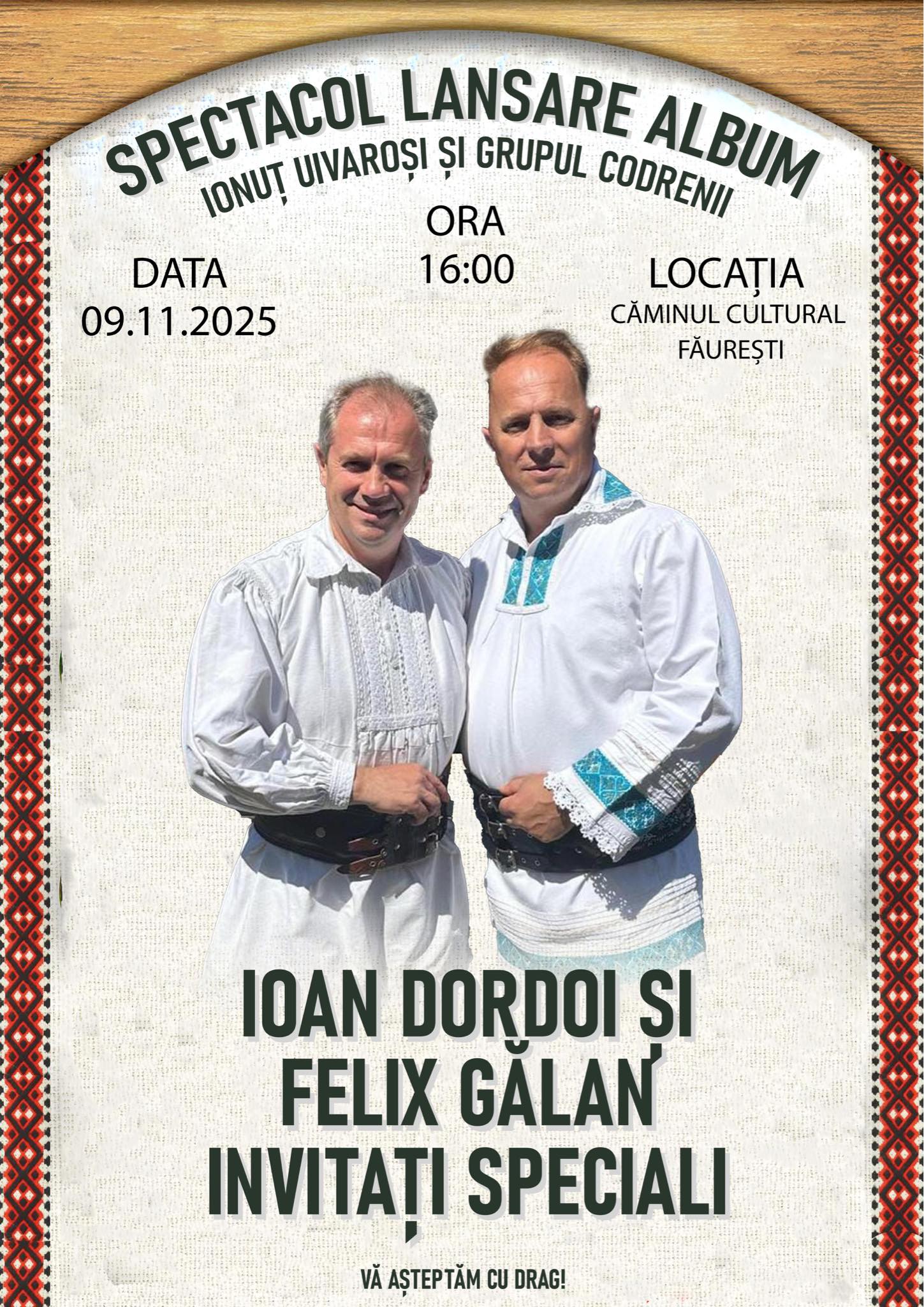 Duminică, 9 noiembrie, începând cu ora 16:00, Căminul Cultural din Făurești va deveni locul de întâlnire al iubitorilor de folclor, găzduind un eveniment deosebit: lansarea unui album semnat de Ionuț Uivaroși, alături de Grupul Codrenii.