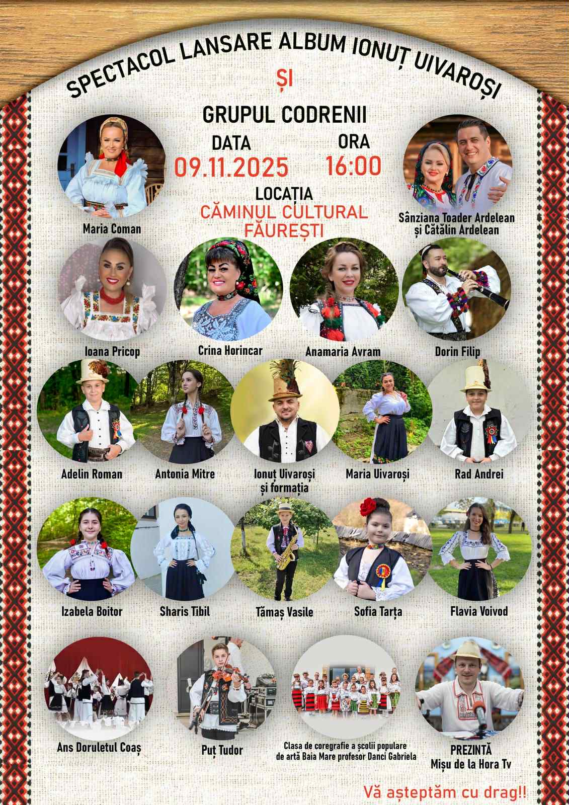 Duminică, 9 noiembrie, începând cu ora 16:00, Căminul Cultural din Făurești va deveni locul de întâlnire al iubitorilor de folclor, găzduind un eveniment deosebit: lansarea unui album semnat de Ionuț Uivaroși, alături de Grupul Codrenii.