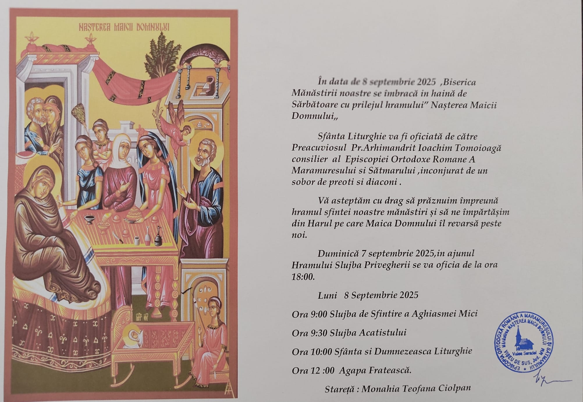 Sunteți invitați la hramul Mănăstirii „Nașterea Maicii Domnului” Vișeu de Sus
