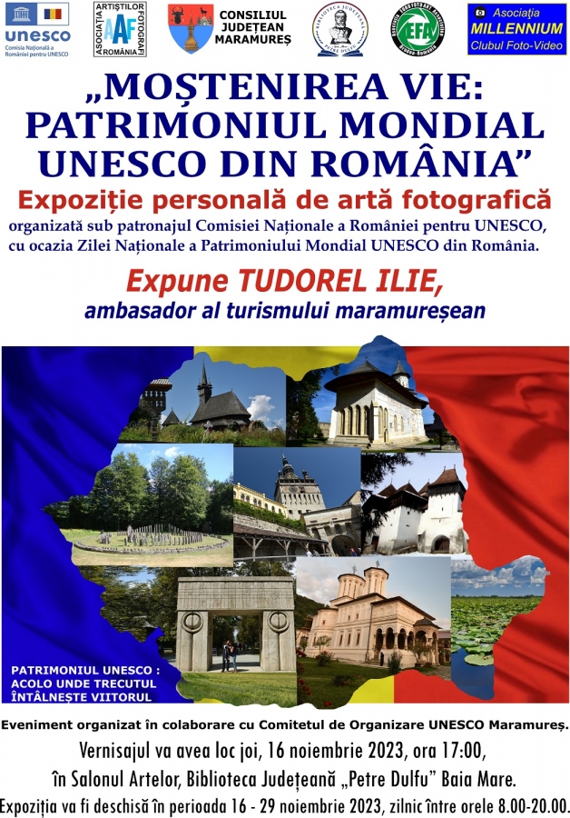 Joi, 16 noiembrie, de la ora 17.00, în Salonul Artelor din cadrul Bibliotecii Județene „Petre Dulfu” Baia Mare va avea loc vernisajul Expoziţia de artă fotografică itinerantă „Moștenirea vie: Patrimoniul Mondial UNESCO din România”. Autor este Tudorel Ilie, ambasador al turismului maramureșean.