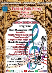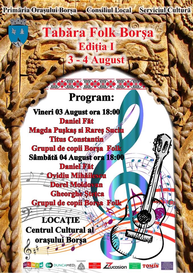 În zilele de 3 și 4 august, de la orele 18.00, pe scena Centrului Cultural Borșa din Borșa se va desfășura prima ediție a “Taberei Folk Borșa”. Tabăra reunește interpreți de marcă ai folk-ului românesc, dar și artiști locali. Iată și programul anunțat: