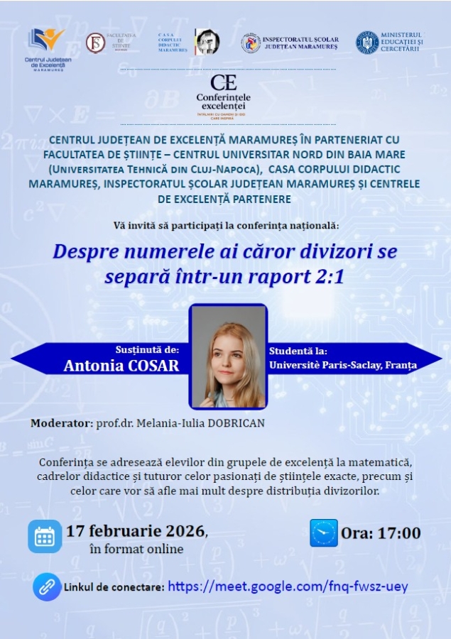 În cadrul proiectului național „Conferințele Excelenței. Întâlniri cu oameni și idei care inspiră”, Centrul Județean de Excelență Maramureș, în colaborare cu Facultatea de Științe a Centrului Universitar Nord Baia Mare, Casa Corpului Didactic Maramureș și Inspectoratul Școlar Județean Maramureș organizează conferința în format online „Despre numerele ai căror divizori se separă într-un raport 2:1”, care va fi susținută de către studenta Antonia Cosar, în data de 17 februarie de la ora 17:00.