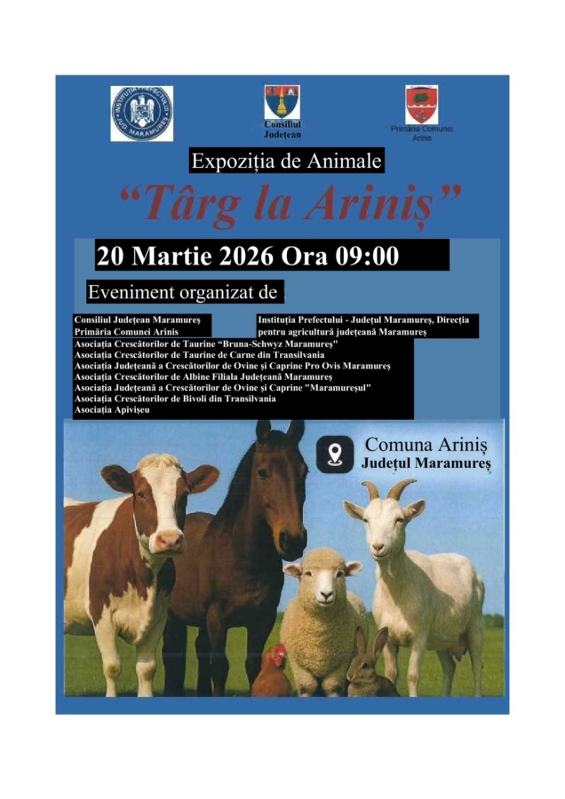 Primăria comunei Ariniș, Maramureș, anunță desfășurarea expoziției de ovine, cabaline, bovine și caprine în cadrul evenimentului „Târg la Ariniș”, care va avea loc în datele de 20 martie și 10 aprilie, de la ora 09:00. Evenimentul este organizat în parteneriat cu asociațiile crescătorilor de animale din județ, cu sprijinul Consiliului Județean Maramureș.
