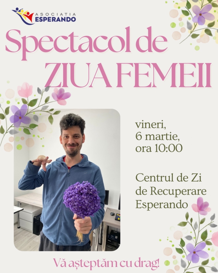 Asociația Esperando din Baia Mare vă invită, în data de 6 martie, la un spectacol deosebit care celebrează frumusețea și sensibilitatea feminină, cu prilejul Zilei Internaționale a Femeii. Evenimentul va avea loc de la ora 10:00, la Centrul de Zi de Recuperare Esperando situat pe strada Colonia Topitorilor, nr. 14A.
