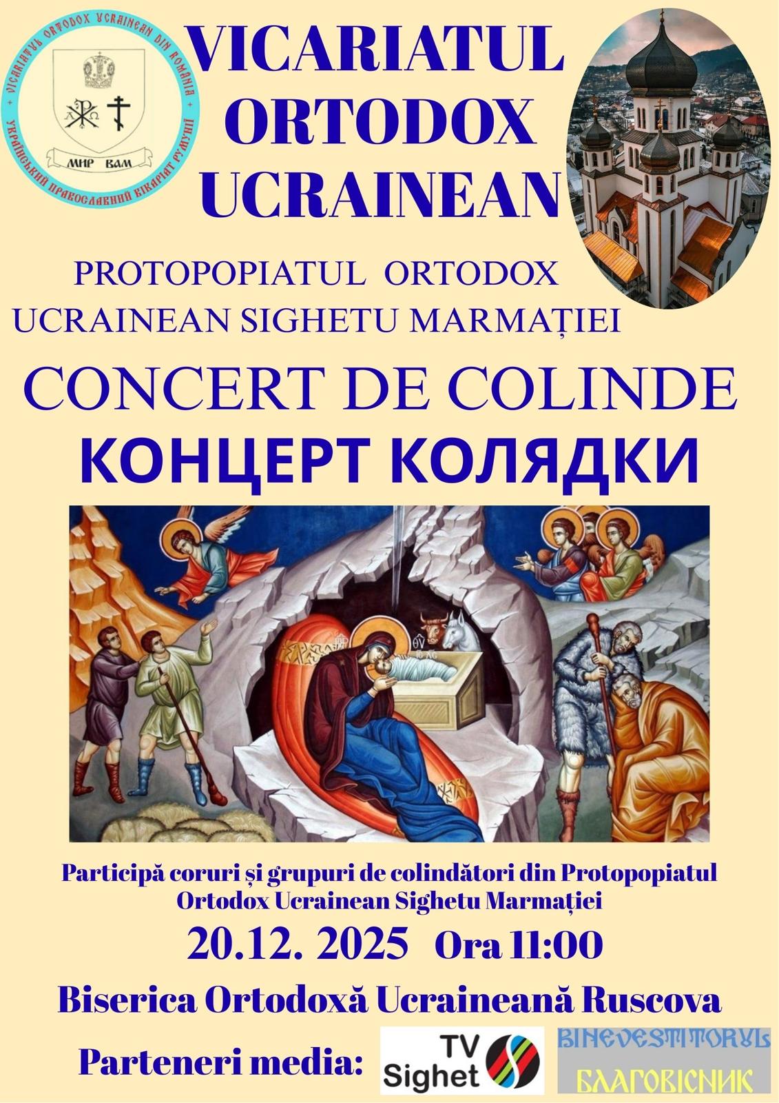 Sâmbătă, 20 decembrie, de la ora 11.00, la Biserica Ortodoxă Ucraineană „Sf.Proroc Ilie” din Ruscova va avea loc Concertul de Colinde, organizat de Vicariatul Ortodox Ucrainean din România, Protopopiatul Sighet, cu binecuvântarea părintelui Vicar Marius N. Lauruc.