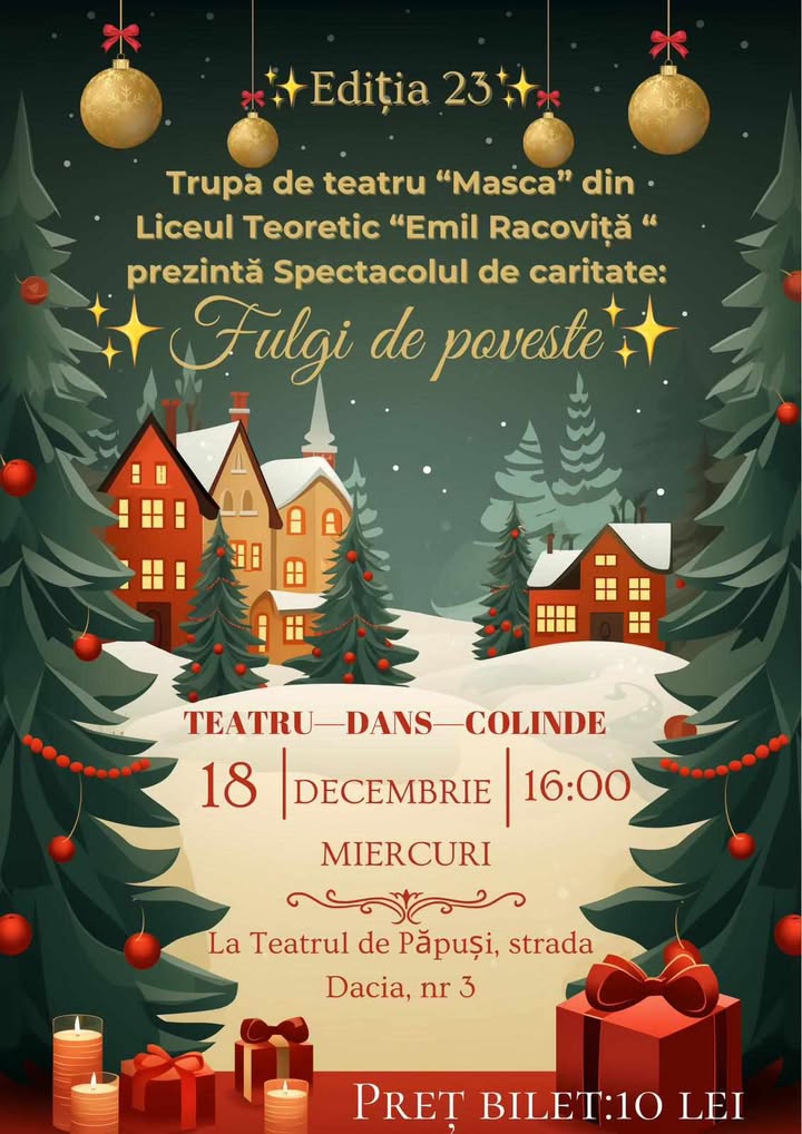 Trupa de teatru „Masca” din cadrul Liceului „Emil Racoviță” vă invită la Spectacolul de caritate „Fulgi de poveste”