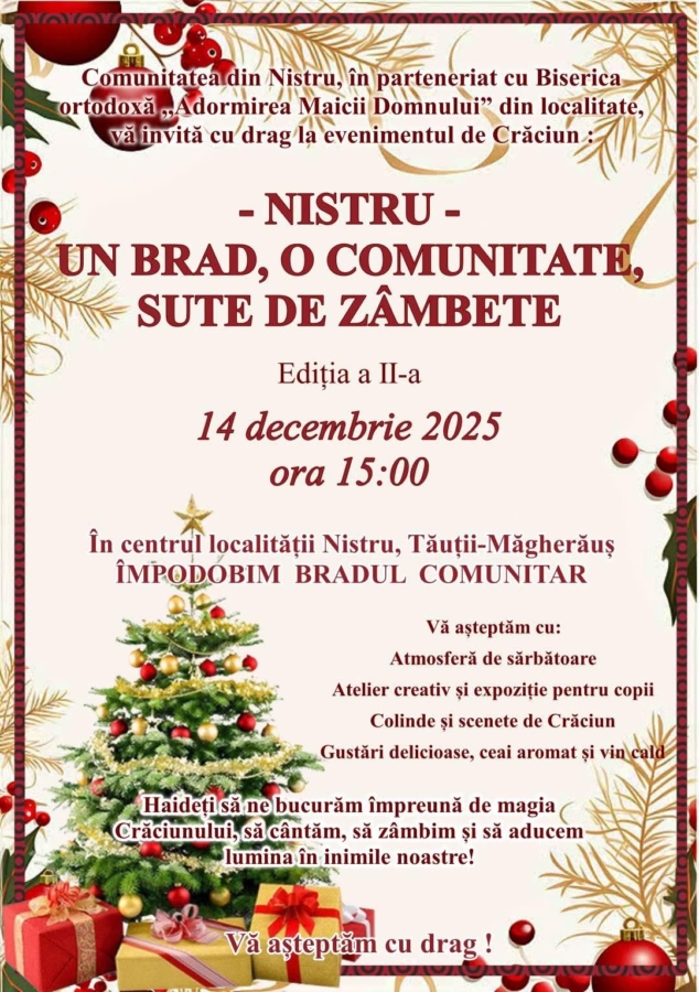 Cetățenii sunt invitați să împodobească împreună bradul comunitar, într-o atmosferă de sărbătoare. Evenimentul promite să aducă magia Crăciunului în sufletele tuturor celor prezenți prin colinde, scenete tematice, ateliere creative și expoziții pentru copii, dar și gustări delicioase.