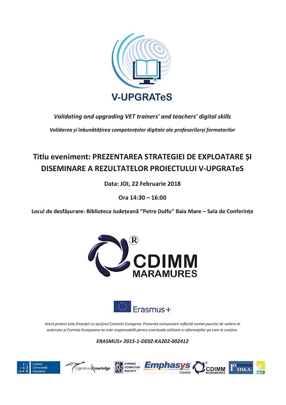 Joi, 22 februarie, ora 14:30, la Sala de conferinţe a Bibliotecii Județene ”Petru Dulfu”va avea loc prezentarea Strategiei de exploatare și diseminare a rezultatelor proiectului V-UPGRATeS din cadrul programului Erasmus+. Proiectul este implementat de Fundaţia CDIMM Maramureş și are ca obiective validarea şi îmbunătăţirea competenţelor digitale ale profesorilor şi formatorilor.