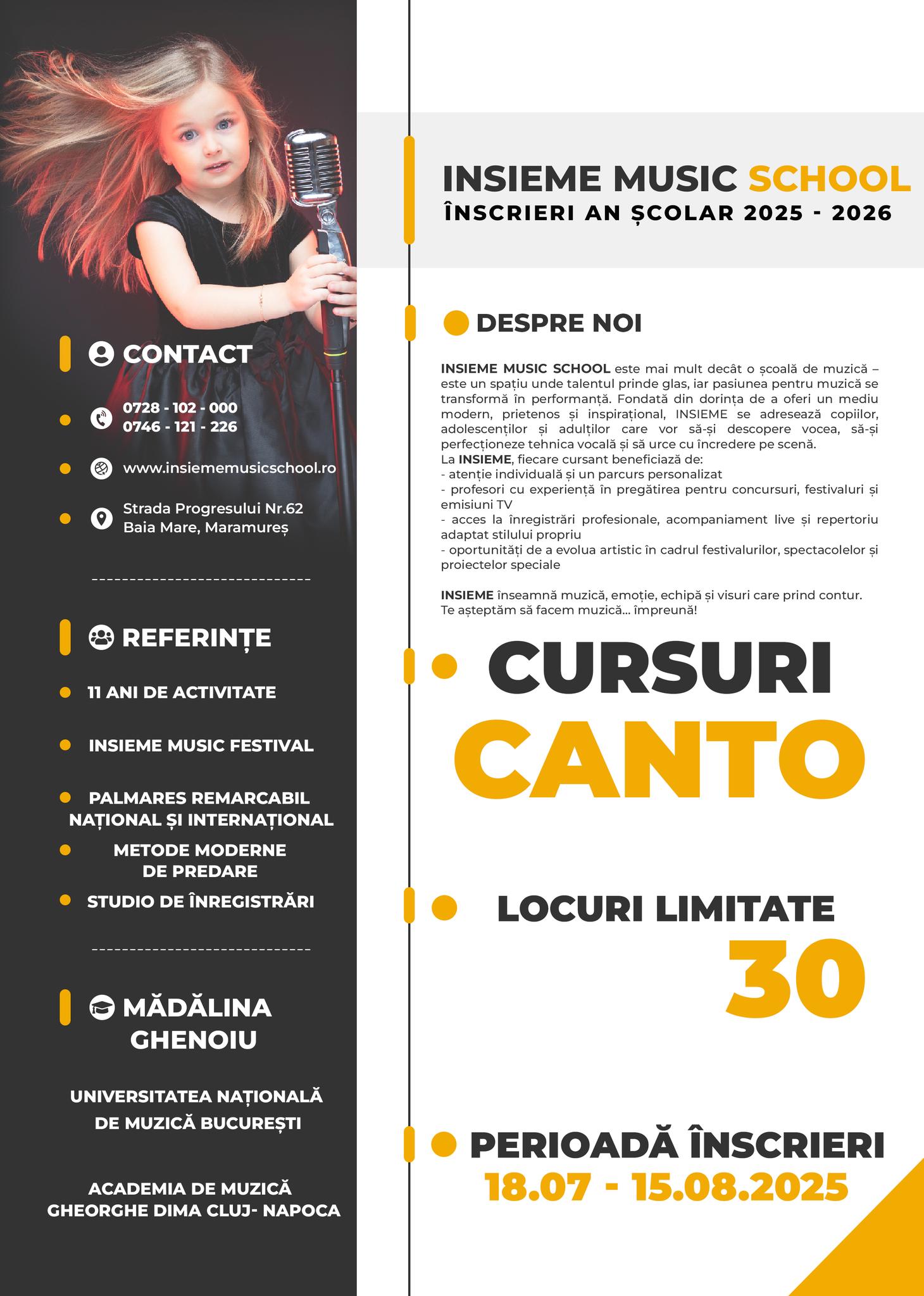 Insieme Music School Baia Mare a dat startul înscrierilor pentru cursurile de canto dedicate anului școlar 2025–2026.