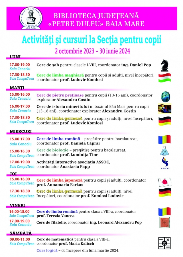Biblioteca Județeană „Petre Dulfu” Baia Mare, Secția pentru copii, anunță că de la începutul lunii octombrie încep mai multe activități și cursuri pentru copii. Acestea sunt diverse și gratuite.