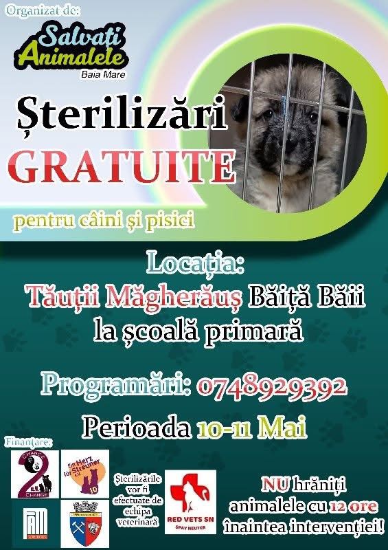 Salvați Animalele Baia Mare organizează o campanie de sterilizări gratuite pentru câini și pisici, în zilele de 10 și 11 mai, în Băița Băii (Tăuții Măgherăuș), la școala primară.