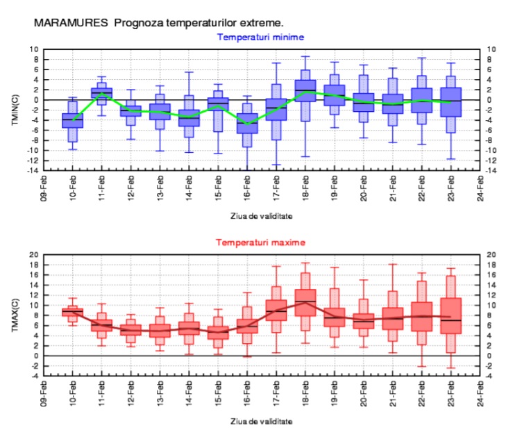 Regimul termic. În prima săptămână de prognoză, în medie se vor înregistra maxime de 5-6 ͦ C, iar în zilele de 17 și 18 februarie se pot atinge maxime ridicate pentru această perioadă, în jurul a 10 ͦ C, după care media va avea un mic recul la 7-8 ͦ C.
