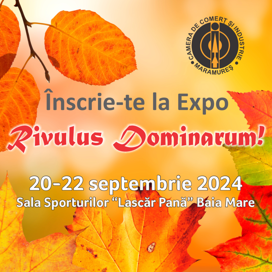 Expo RIVULUS DOMINARUM, organizată de către Camera de Comerț și Industrie Maramureș, se va desfășura în perioada 20 – 22 septembrie 2024, în cadrul Sălii Sporturilor ”Lascăr Pană”, precum și pe platoul exterior.
