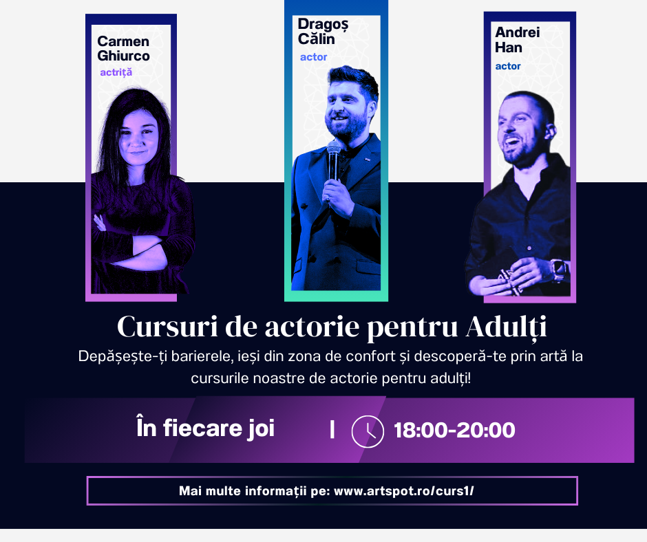 Din 12 septembrie, actorii Dragoș Călin, Carmen Ghiurco și Andrei Han vă invită să descoperiți magia teatrului și arta interpretării, oportunități pe care numai prin intermediul acestui curs le puteți descoperi.